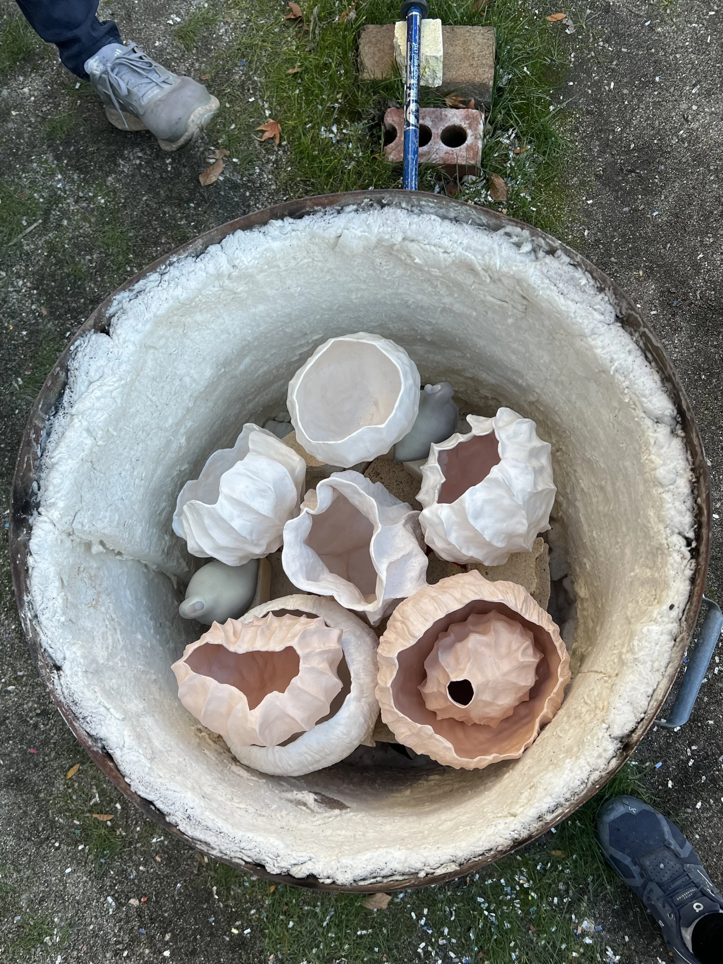 As obvara is a low-fire naked raku technique, the bisque colour remained quite prominent and I much less prefer the pinkish bisque colour of SPS Vashon White Paperclay (Seattle Pottery Supply). Similarly, I found the textured and rougher surfaces to be less successful, but loved how obvara worked on sculptural pieces using paperclay with terra sigilata, which created smooth surfaces with celestial and fossil-like patterning.